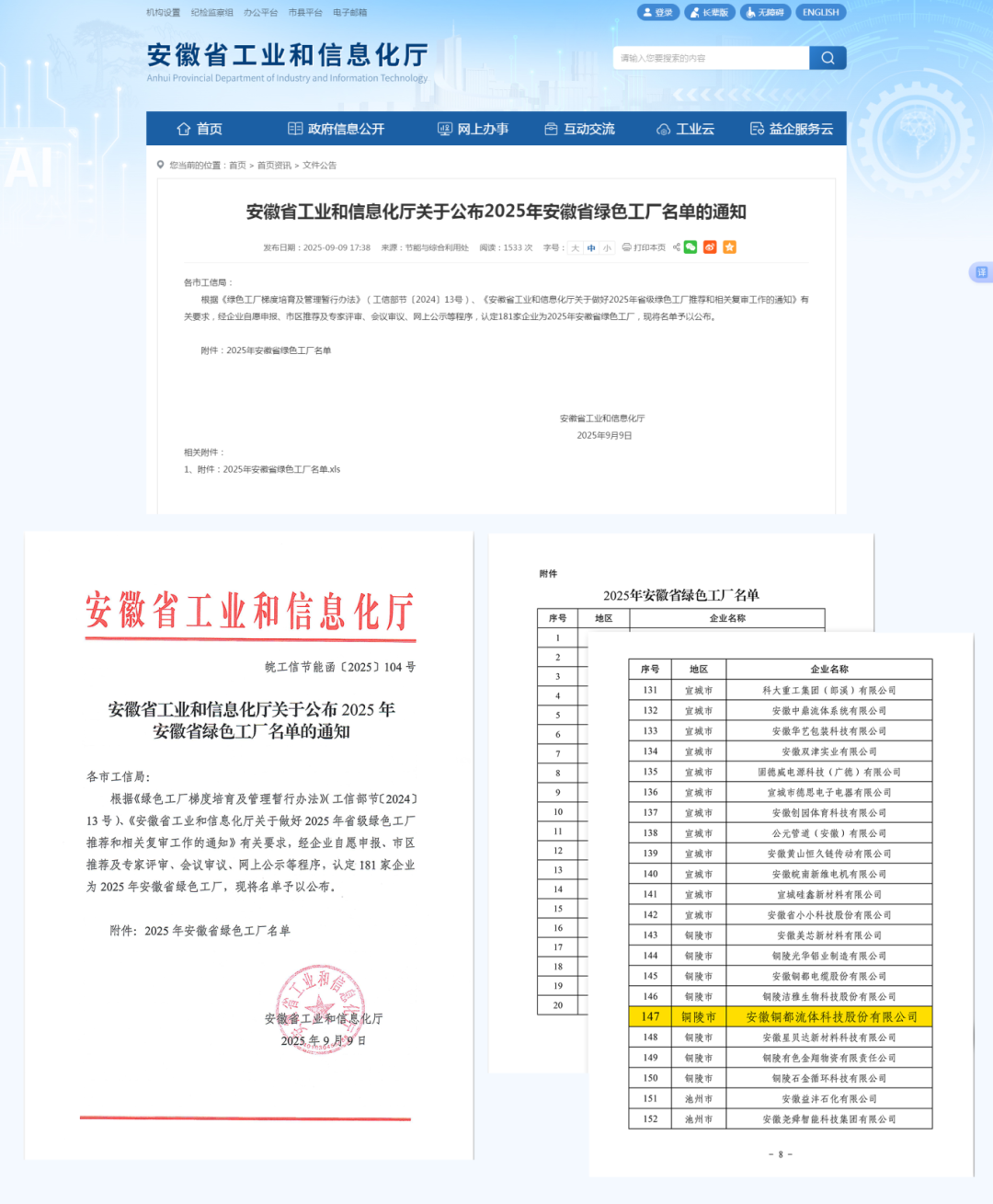 近日,安徽省工业和信息化厅正式公布2025年安徽省绿色工厂名单,铜都流体凭借低碳生产、绿色制造等方面的卓越表现成功入选。